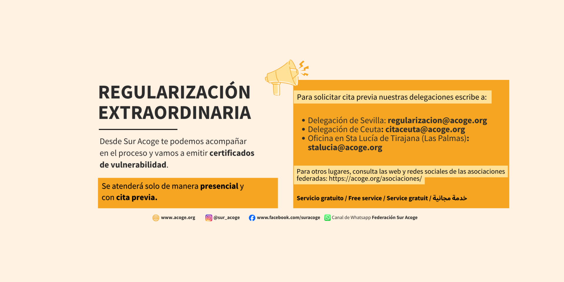 El Gobierno ha aprobado un proceso extraordinario de regularización para personas migrantes que ya residen en España. Este procedimiento permite solicitar una autorización de residencia legal, con permiso para trabajar en todo el territorio estatal y en cualquier sector. La autorización tendrá una vigencia inicial de un año. Desde la Federación Sur Acoge te acompañamos […]