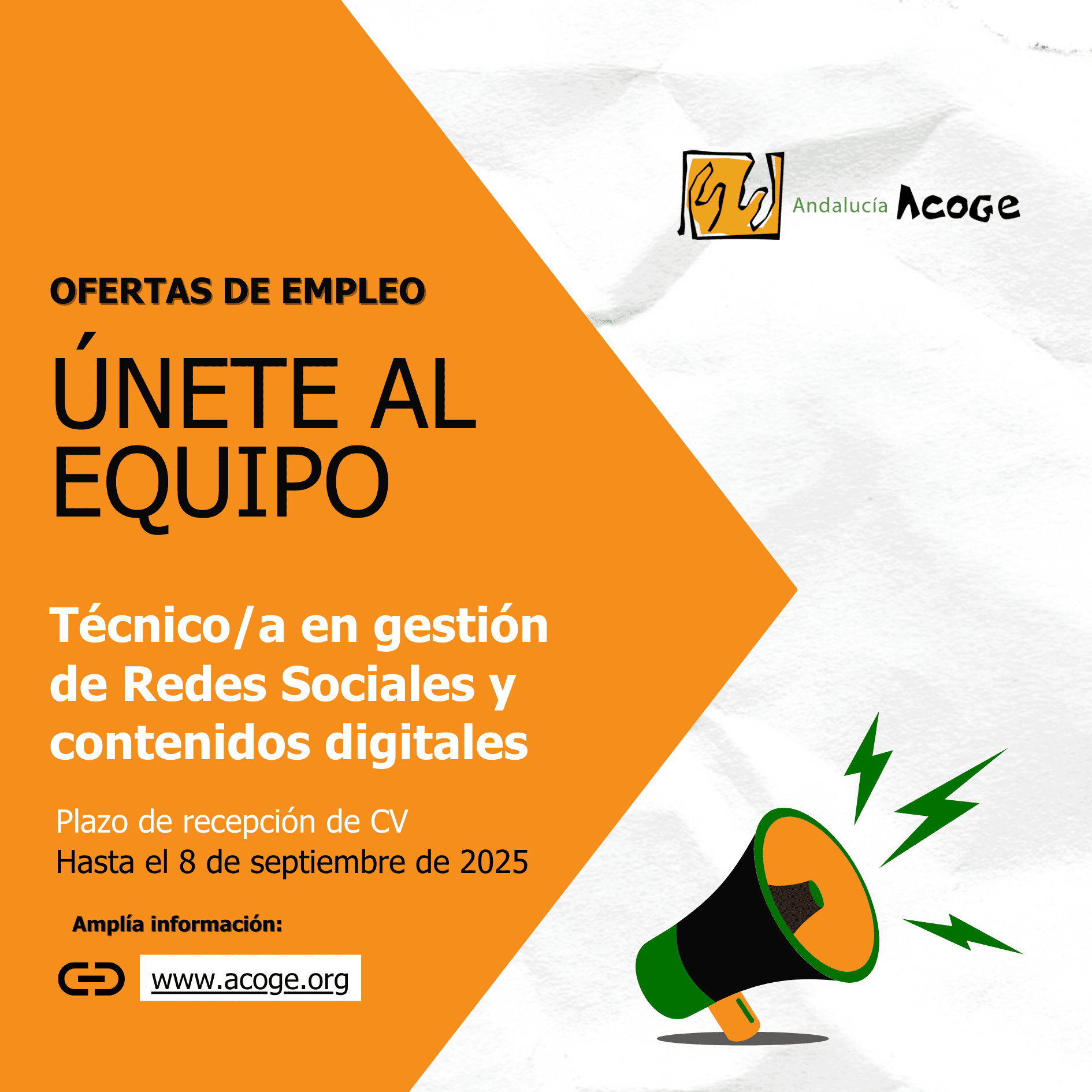 PLAZO CERRADO| Buscamos a un/a profesional de la comunicación digital para incorporarse al área de Comunicación e Incidencia de la Federación Andalucía Acoge. Su labor principal será la planificación, creación y gestión de contenidos en redes sociales, alineados con nuestra estrategia de comunicación y RRSS. Además, participará en acciones de sensibilización, comunicación externa y apoyo a campañas, contribuyendo también a la mejora de la comunicación interna y el fortalecimiento de la marca organizacional.